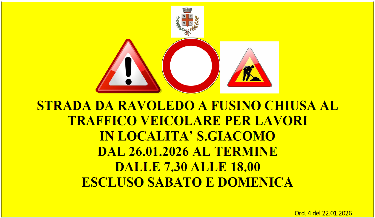 Chiusura veicolare della strada Ravoledo - Fusino in località San Giacomo dal giorno 26/01/2026, sino al termine dei lavori, dalle ore 07:30 alle ore 18:00