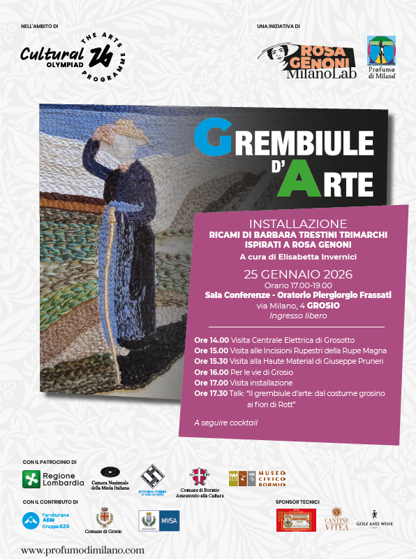I ricami di Barbara Trestini Trimarchi, ispirati a Rosa Genoni, trasformano il grembiule – simbolo del costume grosino – in opera d’arte contemporanea.